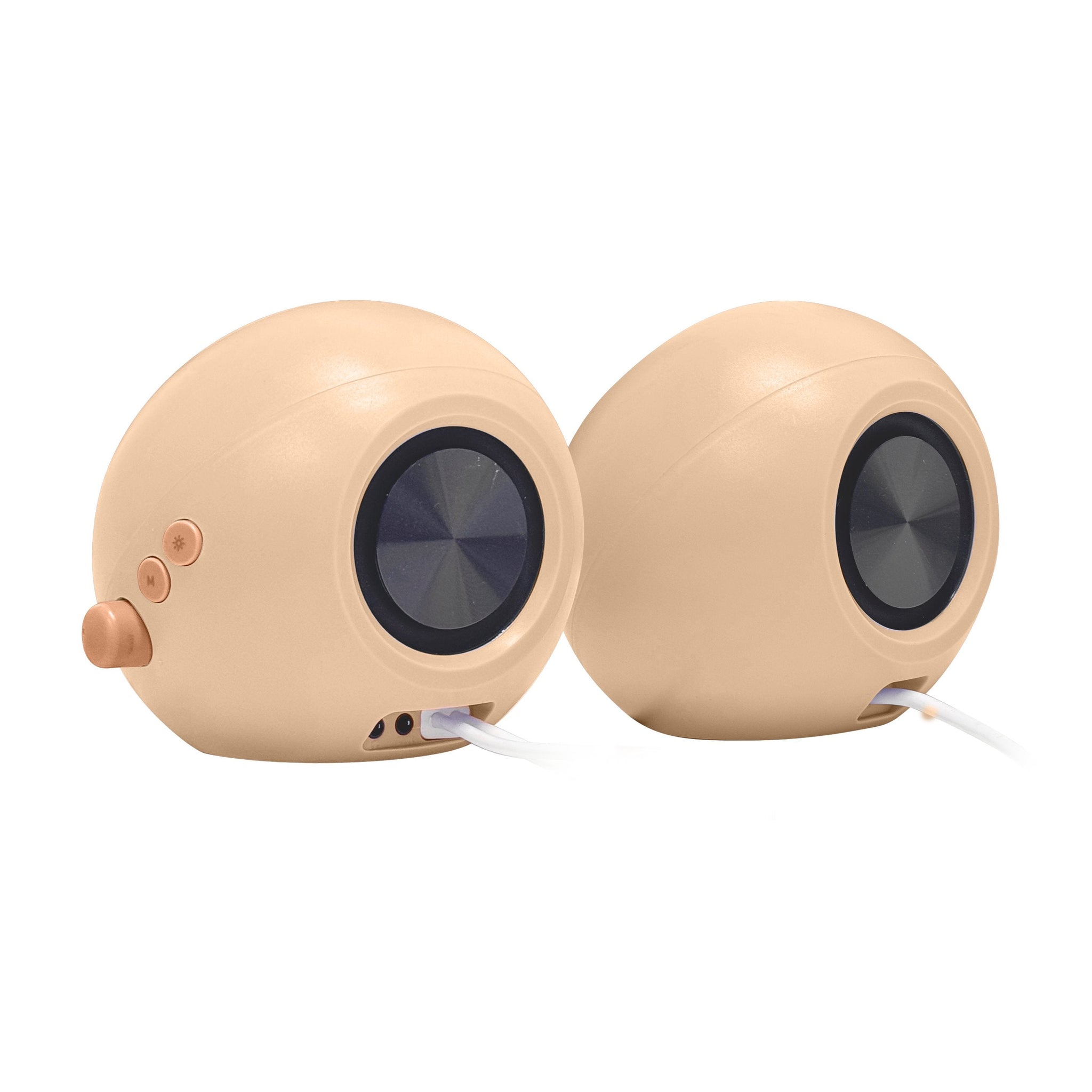 The left and right speakers are connected to each other by a permanent cable. This is the speaker-to-speaker link — your connection to your computer or phone is wireless via Bluetooth or wired via USB/AUX.